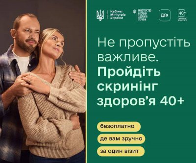 Національна програма Скринінг здоров’я 40+ — це програма, що допомагає людям віком від 40 років виявити серцево-судинні захворювання, цукровий діабет та проблеми ментального здоровʼя ще на ранніх етапах, часто — до появи симптомів, контролювати стан здоров’я й запобігати ускладненням.