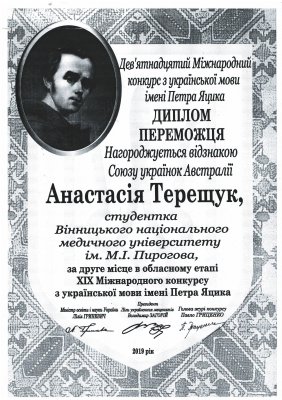 - Степанець Катерину Павлівну, студентку 6 б групи І курсу медичного факультету №1 – ІІІ місце.