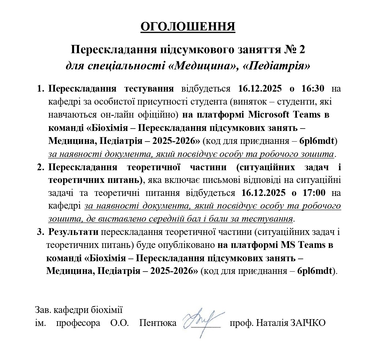 Зав. кафедри біологічної та загальної хімії                   проф. Наталія ЗАІЧКО
