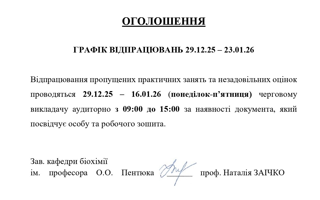 Графік відпрацювань на зимові канікули (біохімія)