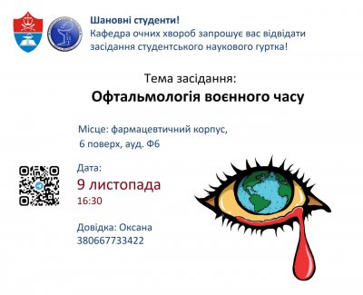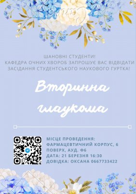 Студентська олімпіада з офтальмології відбудеться 25.04.2024 р. о 17:00 в аудиторії Ф6 фармкорпусу (6 поверх). Бажаючих взяти участь в олімпіаді просимо попередньо записатися, надіславши повідомлення у Viber на номер 095 871 4942.