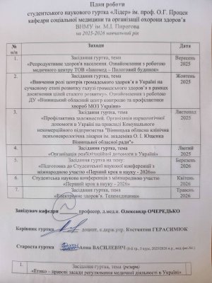 Звіт про результати засідання секції з соціальної медицини, організації та економіки охорони здоров'я ХХІ студентської наукової конференції з міжнародною участю "Перший крок в науку-2024"" Зразок презентації Контактна інформація про організаторів роботи студентського наукового гуртка "Лідер" ім. проф. О. Г. Процек План роботи гуртка "Лідер" ім. проф. О. Г. Процек на 2024-2025 н.р. План роботи гуртка \ Положення про академічну доброчесність, етичні питання та гуманність студентського наукового гуртка "Лідер" ім. проф. О. Г. Процек Положення про роботу студентського наукового гуртка "Лідер" ім. проф. О. Г. Процек Посилання на положення про студентський гурток ВНМУ, про студентське самоврядування, про СНТ Рекомендації до оформлення презентації змісту наукових робіт на засіданнях студентського наукового гуртка "Лідер" ім. проф. О. Г. Процек