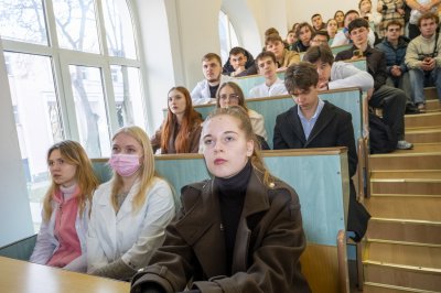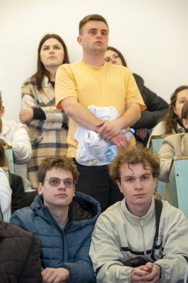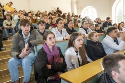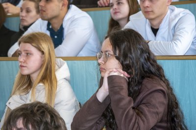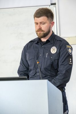 Останню лекцію середи, 25 березня, в аудиторії 5 на запрошення адміністрації університету студентам прочитав лейтенант поліції Вʼячеслав Білоус. Цього разу старший інспектор з особливих доручень відділу звʼязків з громадськістю Управління патрульної поліції у Вінницькій області розповідав майбутнім лікарям, як не стати жертвою вербування та примусу до протиправних дій. І слухали його дуже уважно.
