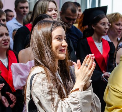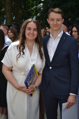 Проте є випускниця, для якої 30 червня відтепер означатиме дві великі дати. Щойно шестикурсниця стоматологічного факультету Тамара Денисюк зійшла по червоній доріжці з дипломом в руках, їй освідчився коханий, який служить в Національній поліції. Під захоплені вигуки й оплески молоду пару привітала Вікторія Петрушенко, зазначивши, що це перший випадок освідчення на випуску у 104-річній історії ВНМУ.